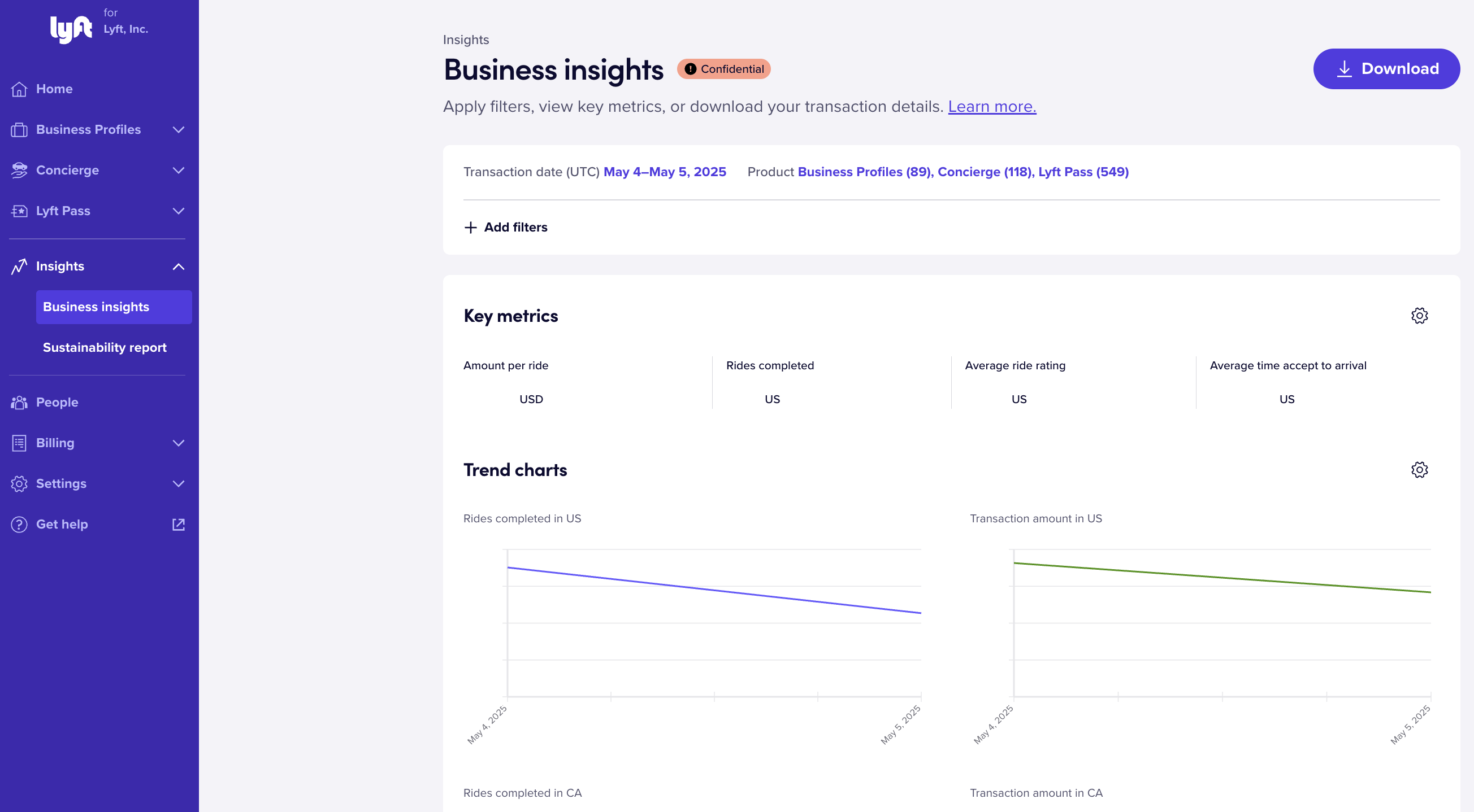 The Insights tab within the Lyft Business Portal enables you to filter for specific rides and transactions, view key metrics, and view/download your company’s transaction report.