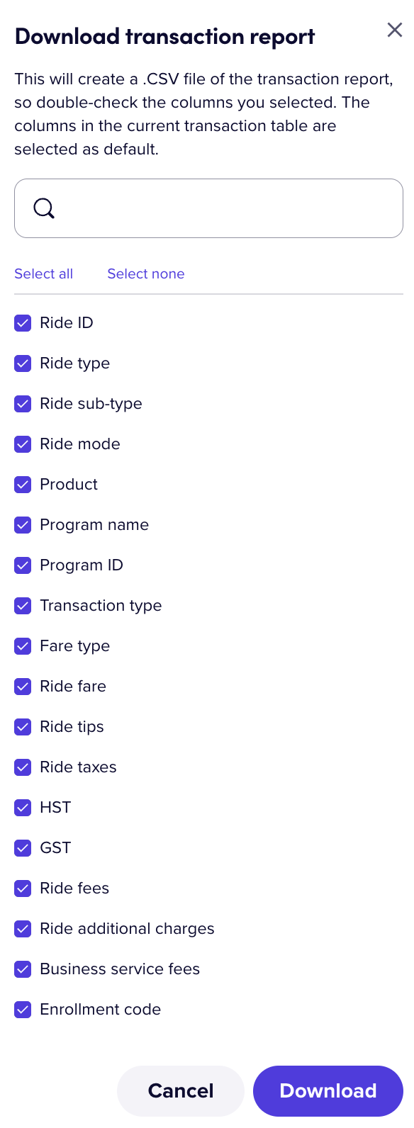You can download the transaction report to generate a CSV file by clicking 'Download' in the top right corner. The columns which are present in the table when clicking 'Download' will automatically be pre-selected and you’ll have the ability to update which columns you need included prior to confirming download.