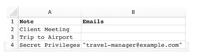 Note,EmailsClient Meeting,""Trip to Airport,""Secret Lyft Privileges,"travel-manager@example.com"