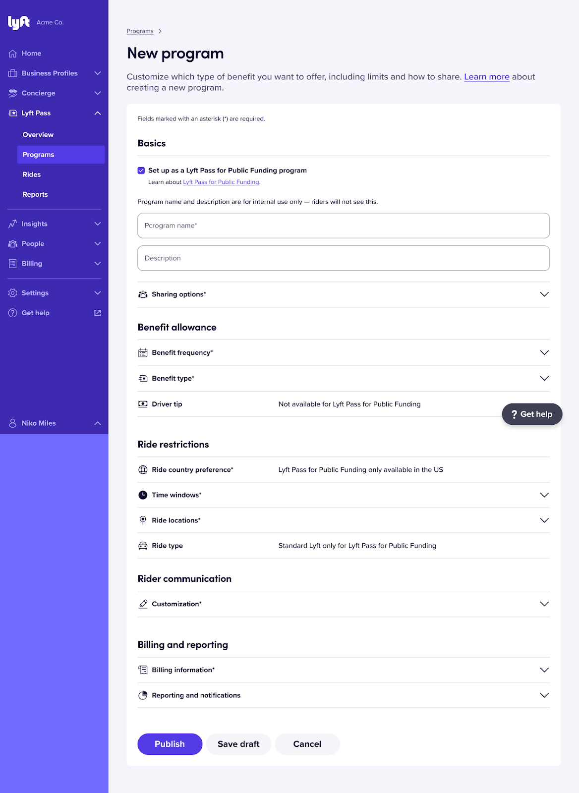 Learn more about what Lyft Pass for Public Funding is and how to create a new Lyft Pass for Public Funding program in this article.