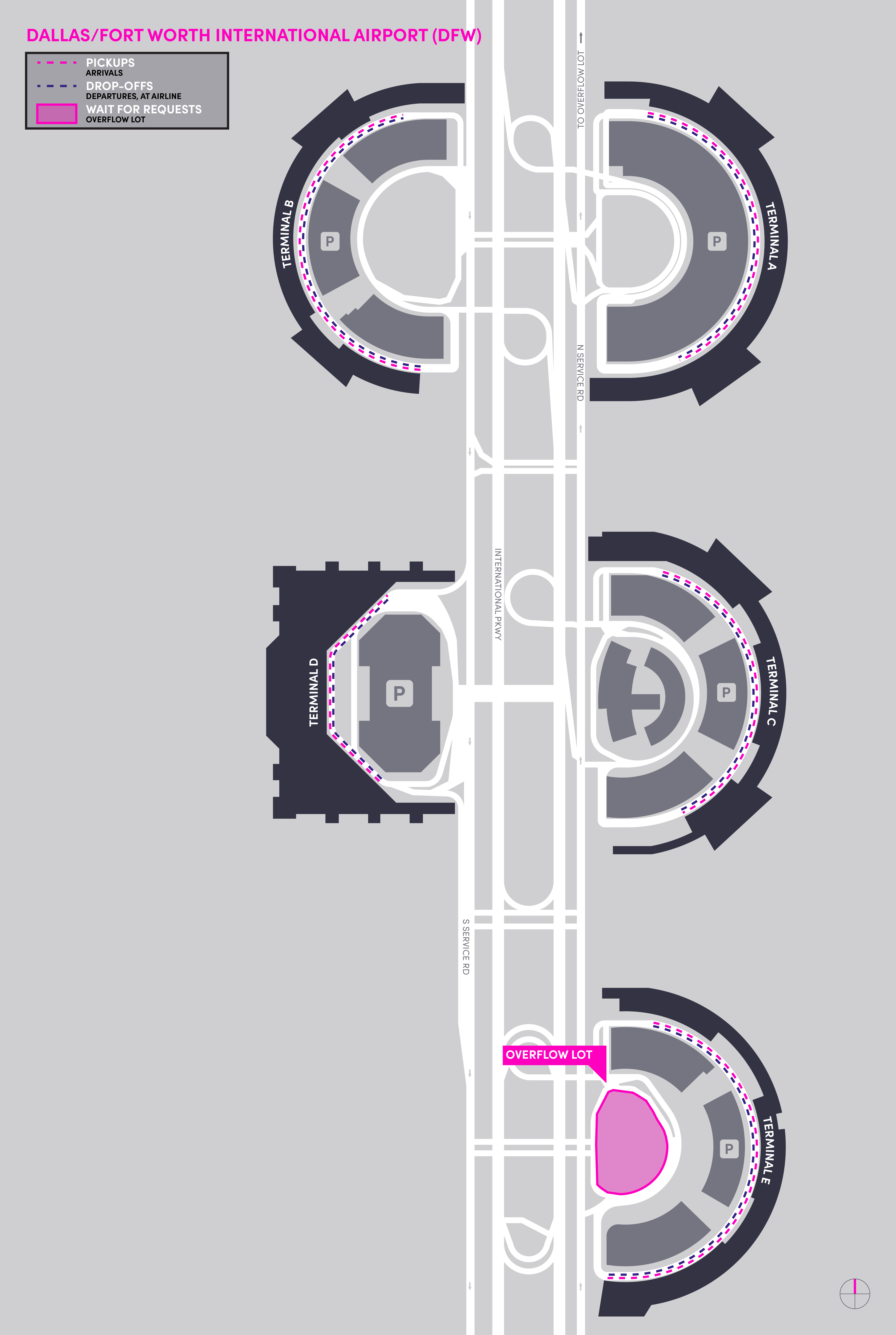 - O estacionamento auxiliar da TNC na Spirit of Texas Drive será temporariamente fechado. Os motoristas do Lyft ainda poderão usar a principal área de espera da TNC na transversal da Rental Car Road. Quando necessário, o estacionamento na Rental Car Road também será disponibilizado como área de espera.
